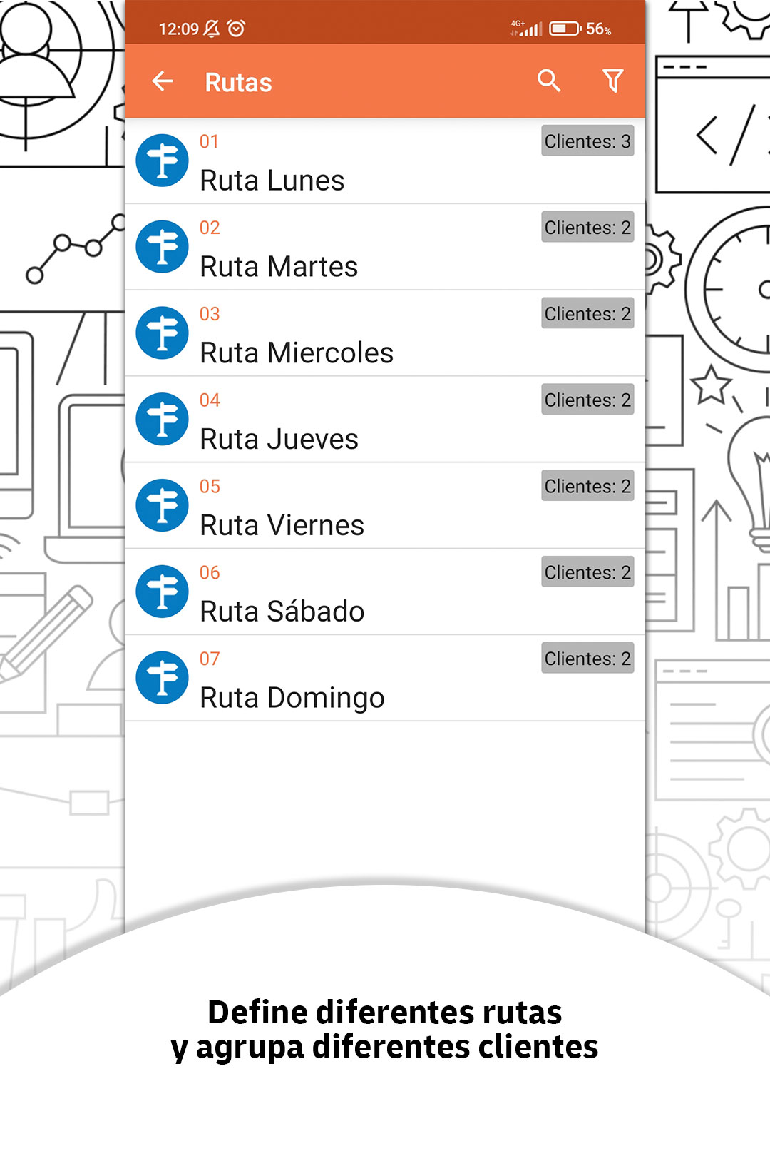Identifica las rutas asignadas a tus agentes, y los clientes que corresponden a cada una de ellas. Acciones rápidas: consulta la ubicación de cada cliente en la ruta, sus datos e incluso llámalos para informarles de cualquier incidencia. Crea filtros completos y totalmente personalizados para gestionar de manera más eficiente tus rutas.